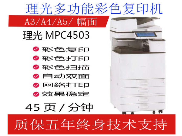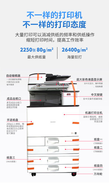 品牌: 齐睿型号: 2503涵盖功能: 复印 打印 扫描打印机类型: 彩色激光接口类型: USB 以太网颜色分类: 理光彩机C2503SP 25张/一分钟 理光彩机 C3003SP 30张/一分钟 理光彩机C3503SP 35张/一分钟 理光彩机C4503SP 45张/一分钟 理光彩机C5503SP 55张/一分钟 理光彩机C6003SP 60张/一分钟 理光彩机c3504 35张/一分钟 理光彩机c4504 45张/一分钟 理光彩机c5504 55张/一分钟 理光彩机c4000 40张/一分钟 理光彩机c5000 50张/一分钟最大幅面: A3及A3以上是否支持网络打印: 无线网络打印 有线/无线网络打印是否支持自动双面打印: 自动套餐类型: 官方标配生产企业: 齐瑞打印速度: 25-55张适用场景: 商务办公一体机类型: 彩色激光多功能一体机耗材类型: 鼓粉分离上市时间: 2020-09-23月负荷量: 5万印